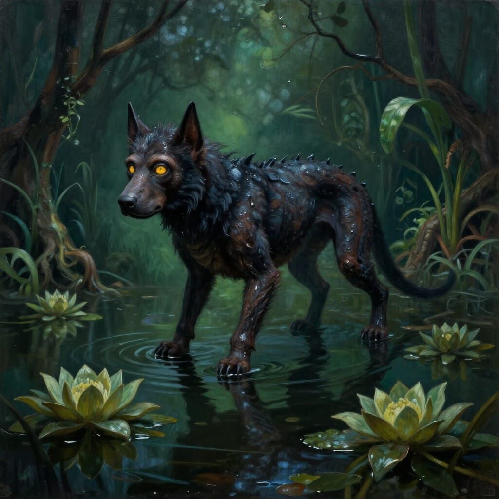 This oil painting depicts a shadowy Mexica water beast with canine, primate, and reptilian features. Its eyes glow from the dark lake, surrounded by dense vegetation and distorted reflections, creating an ominous, ancestral warning.
