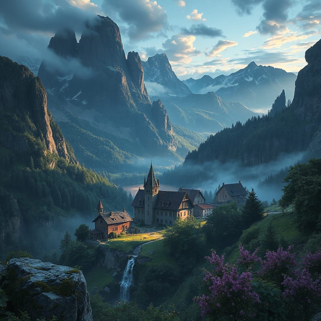 This image showcases an enchanted village nestled in a lush valley, framed by majestic mountains and cascading waterfalls. Rendered with deep blues, purples, and golden lights, it evokes a whimsical fantasy atmosphere.