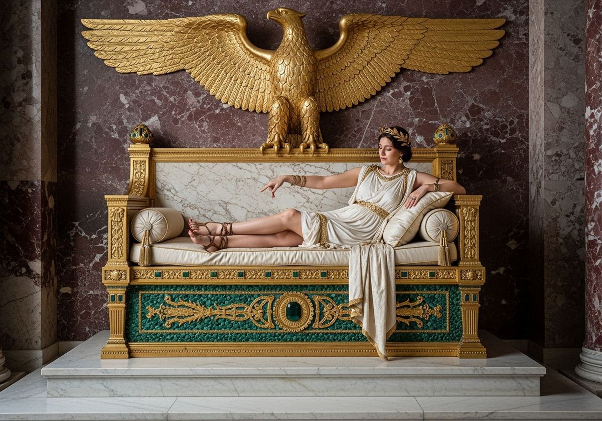 This image depicts a lavish throne room in an ancient Roman palace, featuring Empress Messalina reclining on a gold, marble, and emerald triclinium. The scene is captured with natural lighting and ultra-sharp focus.