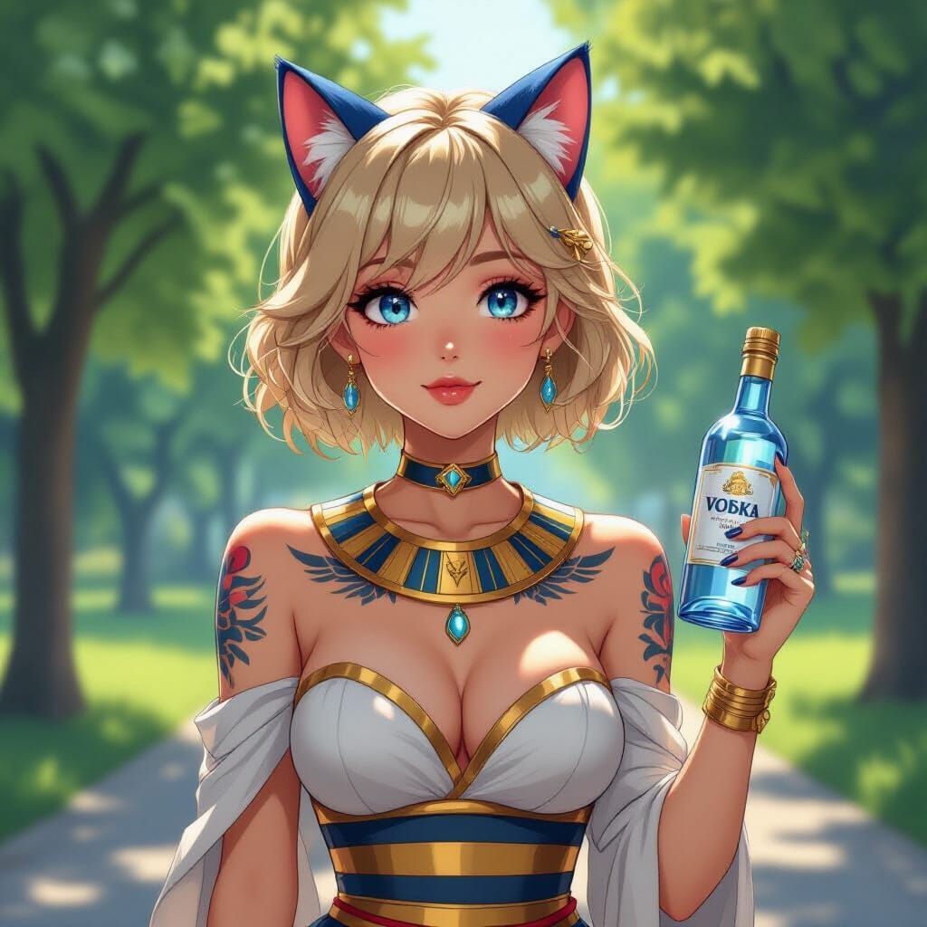 This image shows a blonde woman with cat ears and wings tattoos, wearing an Egyptian princess outfit while holding vodka in a park. Rendered in a vibrant anime style.