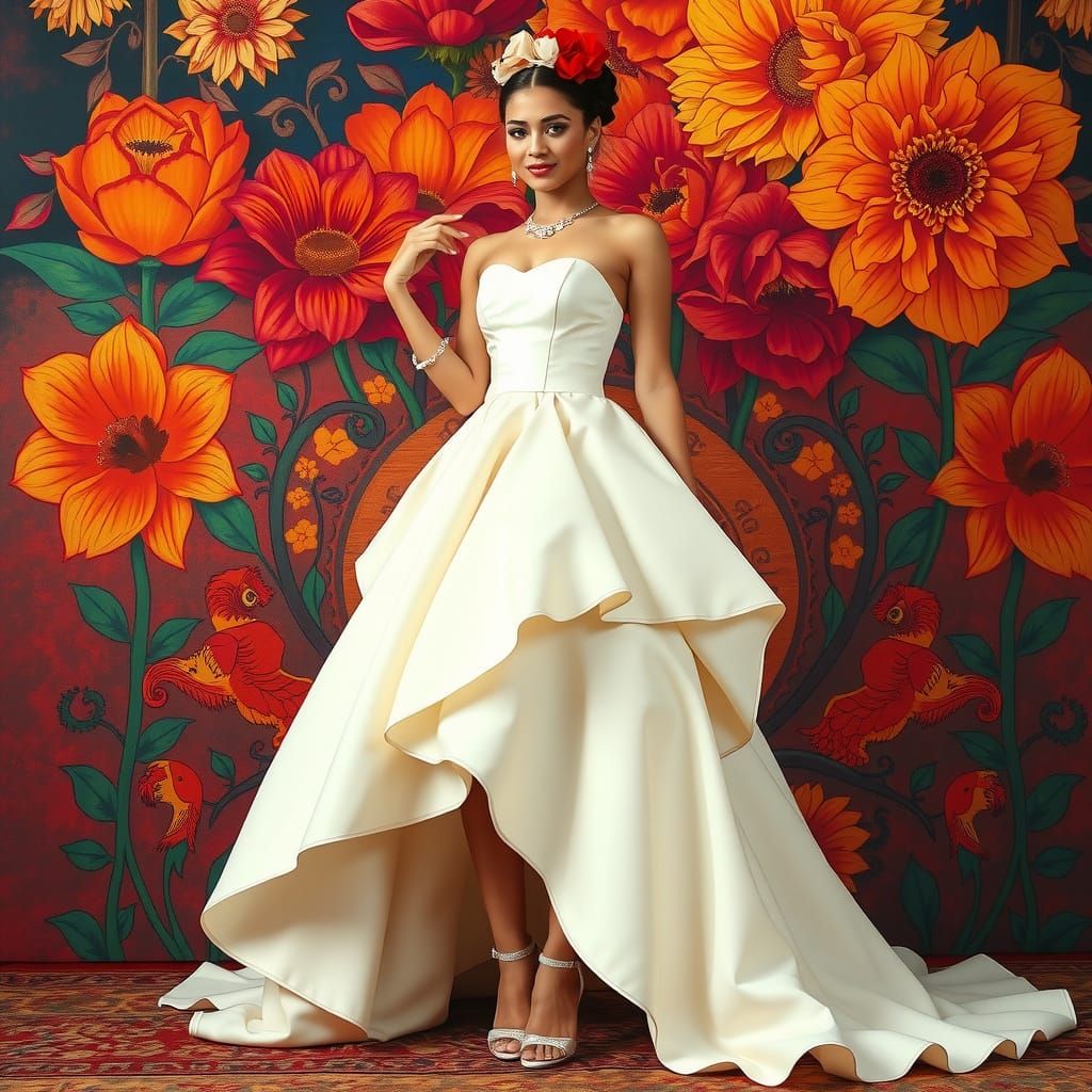This image showcases a 21-year-old Mexican woman in a breathtaking wedding dress with a fitted bodice and dramatic skirt, paired with elegant white and silver heels. The artwork blends vibrant colors and textures reminiscent of Frida Kahlo, with the sophistication of a Gustav Klimt portrait and the dream...