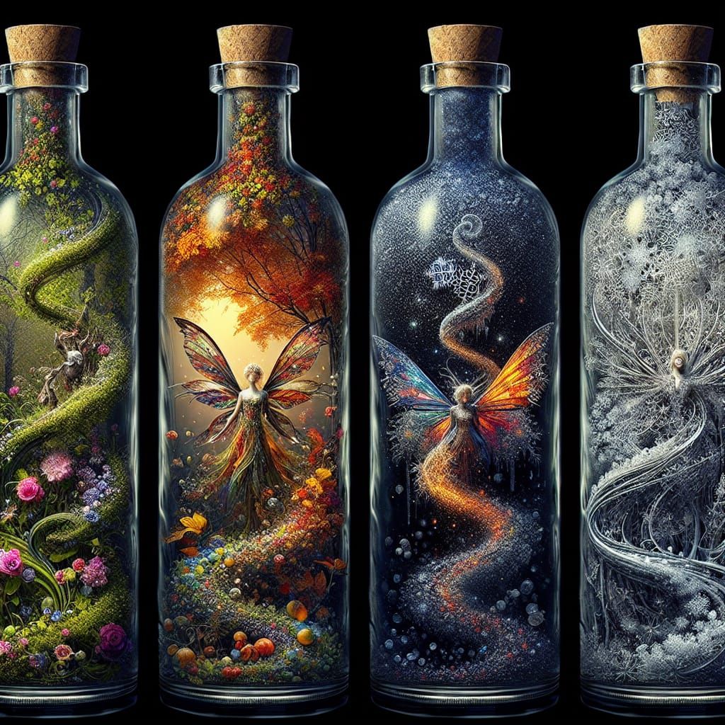 In bottles sealed, four seasons rest, Fairies dance in nature's best. Spring, summer, fall, and winter's might, Captured in glass, a wondrous sight.