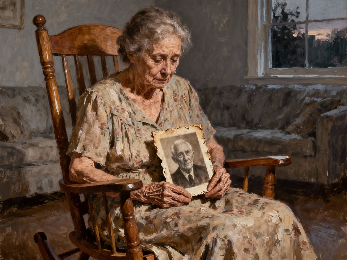 This image shows an elderly woman in an impasto style, sitting in a rocking chair and looking at a photo of her late husband. The mood is sad and the composition is beautiful.