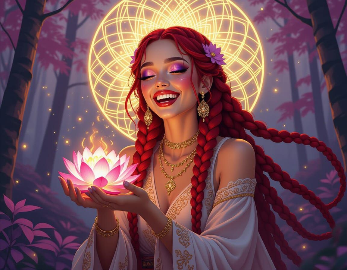 A striking picture of a mystical woman with braided red and black hair and galaxy eyes, set in a mauve forest with golden light. The image is in a futuristic and atmospheric style.