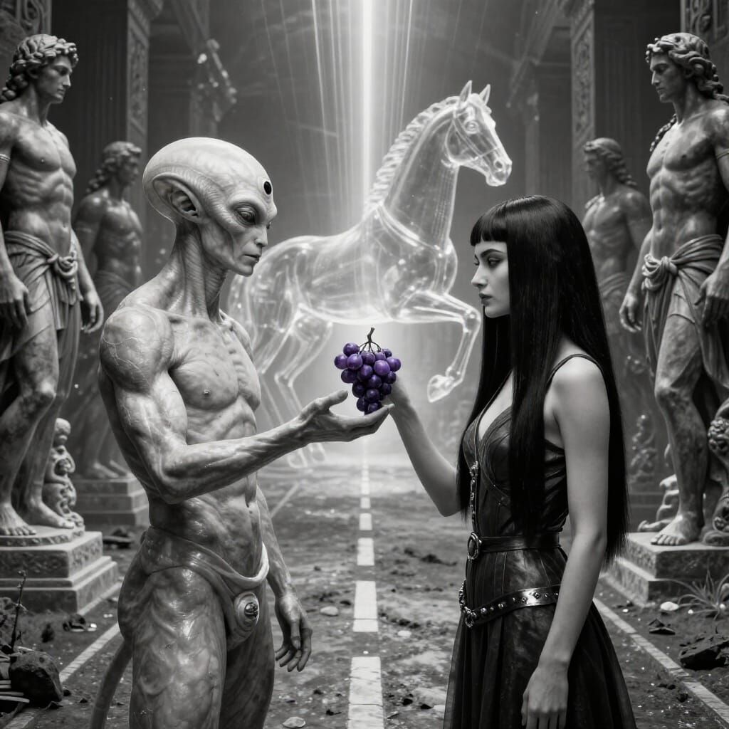 grand blond alien gives small crystal bunch of grapes to beautiful armenian woman with ultra straight hair,