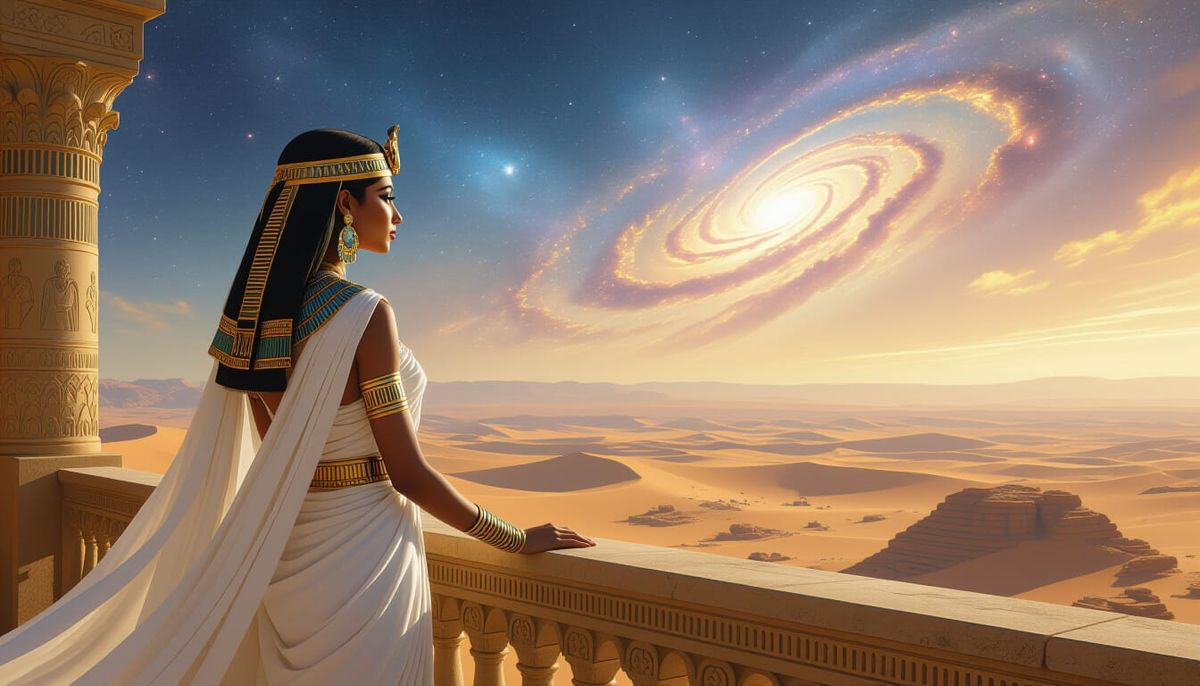 A striking picture of an elegant Egyptian woman on a stone balcony. She is adorned in gold and white, gazing at a desert landscape under a vibrant, galaxy-filled sky, rendered as digital matte painting.