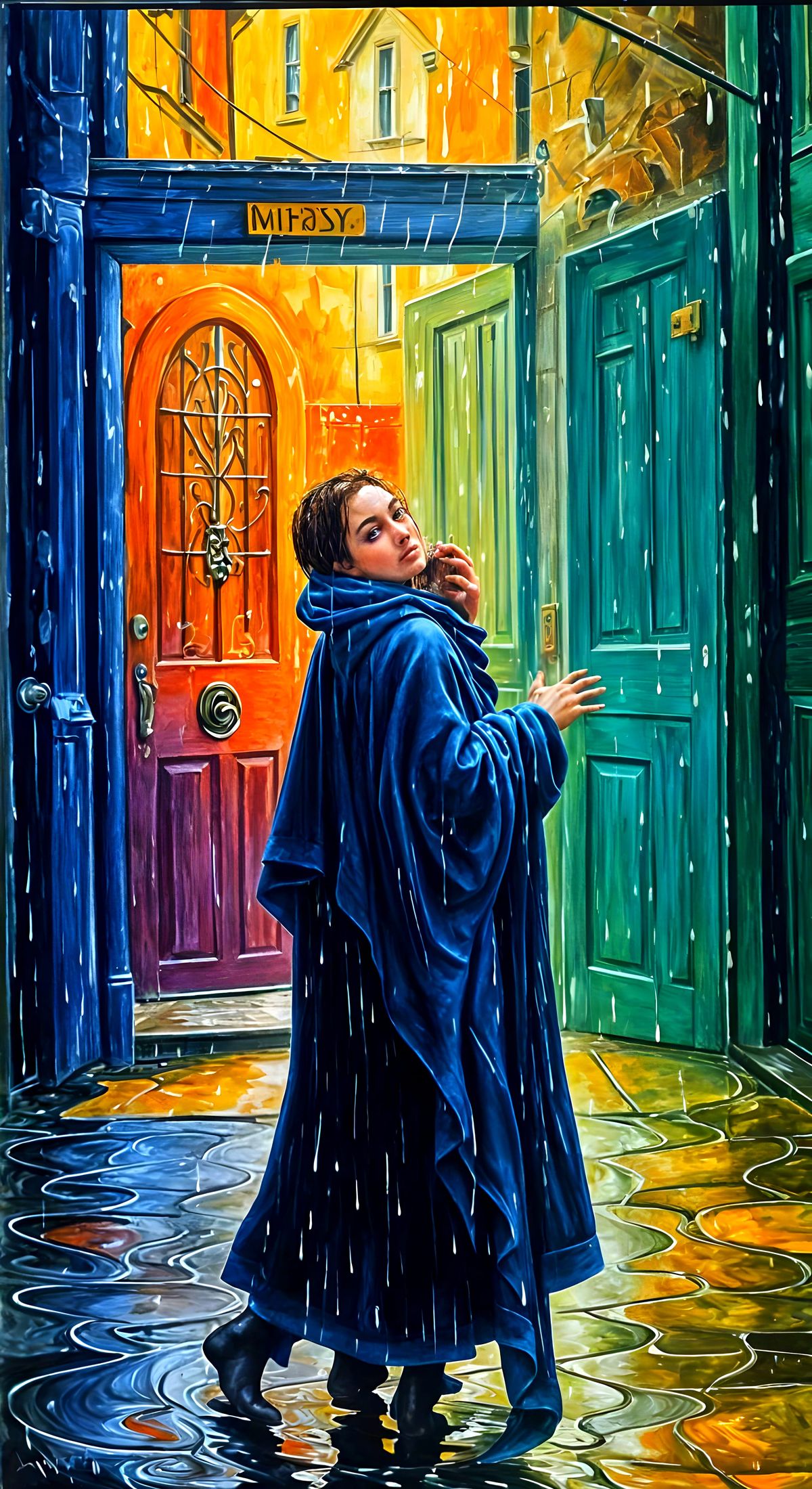 A neo-impressionistic image of a woman holding open a cottage door for a cat. The rainy night is depicted with thick layers of colourful, textured paint in an expressionist style.