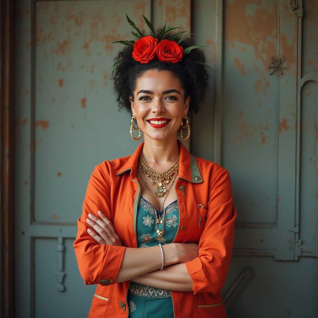 A striking picture of a confident leader in professional attire giving instructions. The portrait features bold outlines and vibrant colors, in the style of surrealist and figurative art.