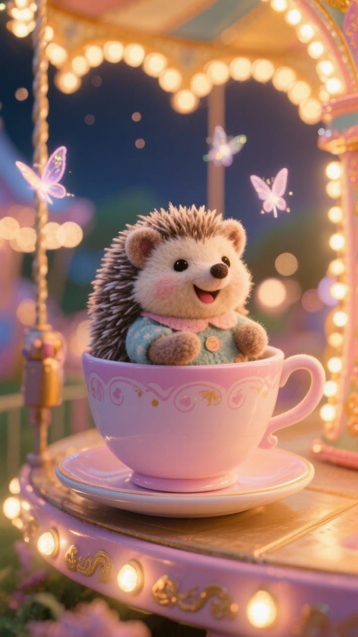 This image shows a charming felt hedgehog in cute clothes, happily spinning in a pastel funfair teacup. Warm fairy lights create a magical, cozy atmosphere with soft textures.
