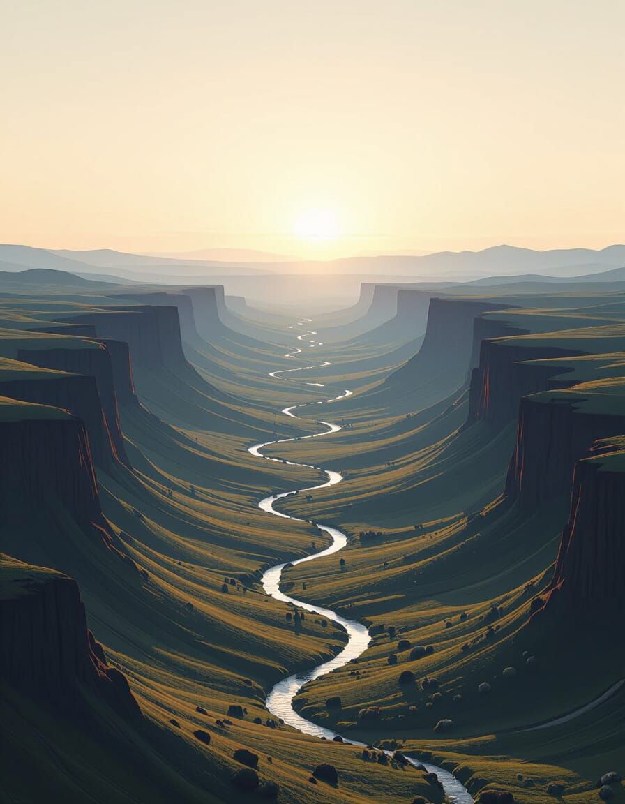 A majestic landscape featuring a vast valley stretching to a deep horizon. This cinematic image captures the wonder of nature in a maximalist, dramatic, and atmospheric digital matte painting style.