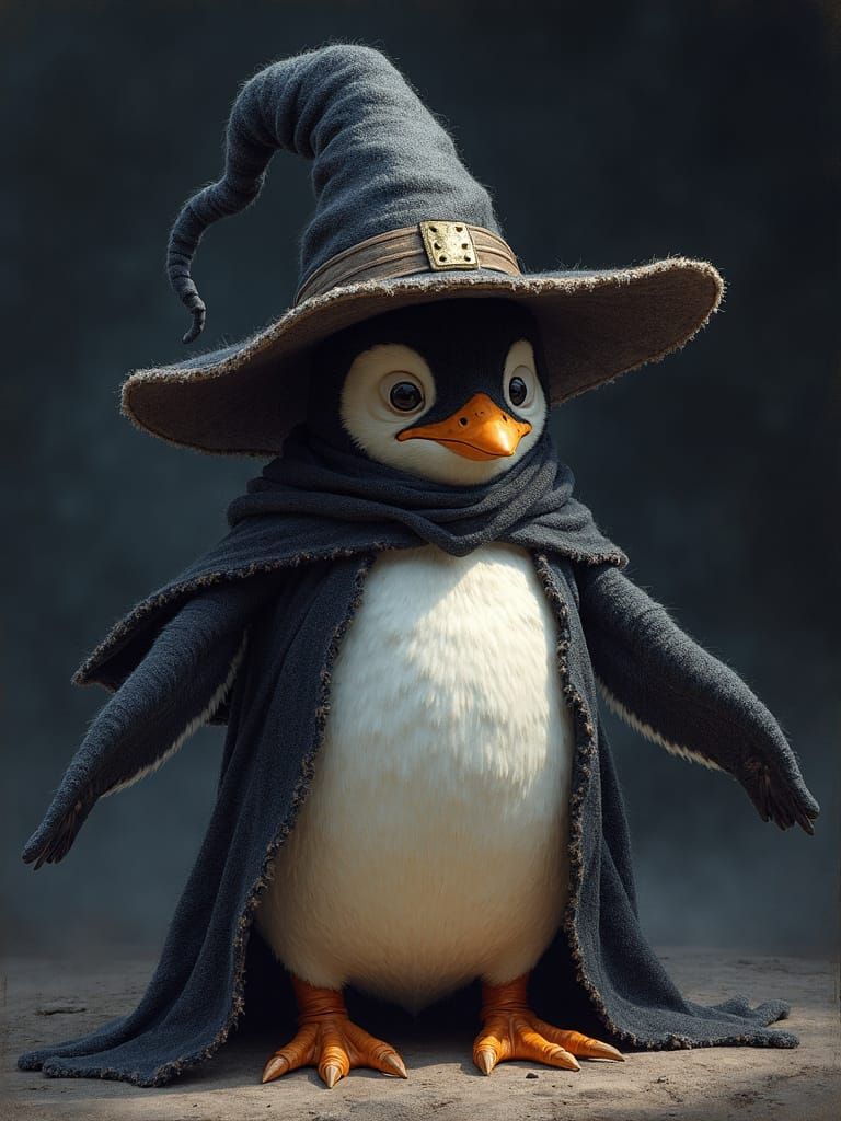 This image depicts a CGI penguin in a dark, mystical wizard costume, set against a black background with soft, ominous lighting. The artwork combines elements of fantasy and cyberpunk styles.
