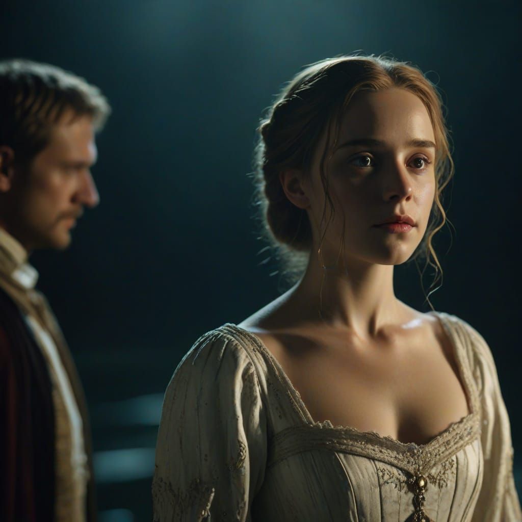 This cinematic image captures a dramatic moment on stage, featuring a medium shot of Ophelia in a gown, set against a backdrop of deep shadows and high contrast, with a textured 35mm film effect and soft focus.