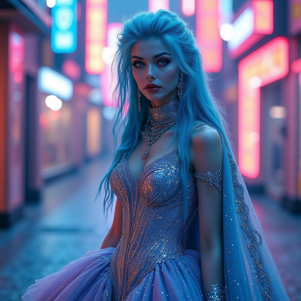 A stunning image of a woman with long wavy blue hair in a vibrant neon city at sunrise. She wears an elegant shimmering ball gown with stardust accents, in a high-fantasy digital art style.