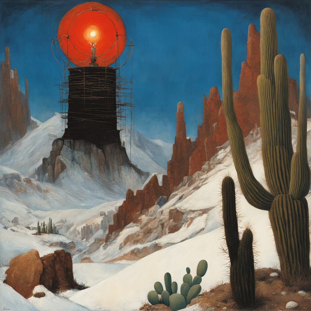 This image shows a surreal composition featuring a lantern, cactus and blueprint fragments. The artwork blends Basquiat-inspired abstract expressionism with Beksiński's dark surrealism.