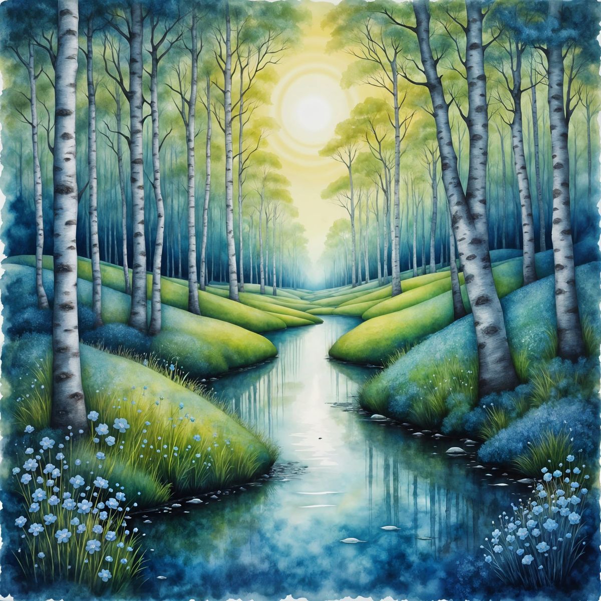 This image depicts a serene birch forest glade with a calm stream reflecting the trees. Lush green grass and opaque blue forget-me-nots fill the scene, rendered in a liquid ink style.