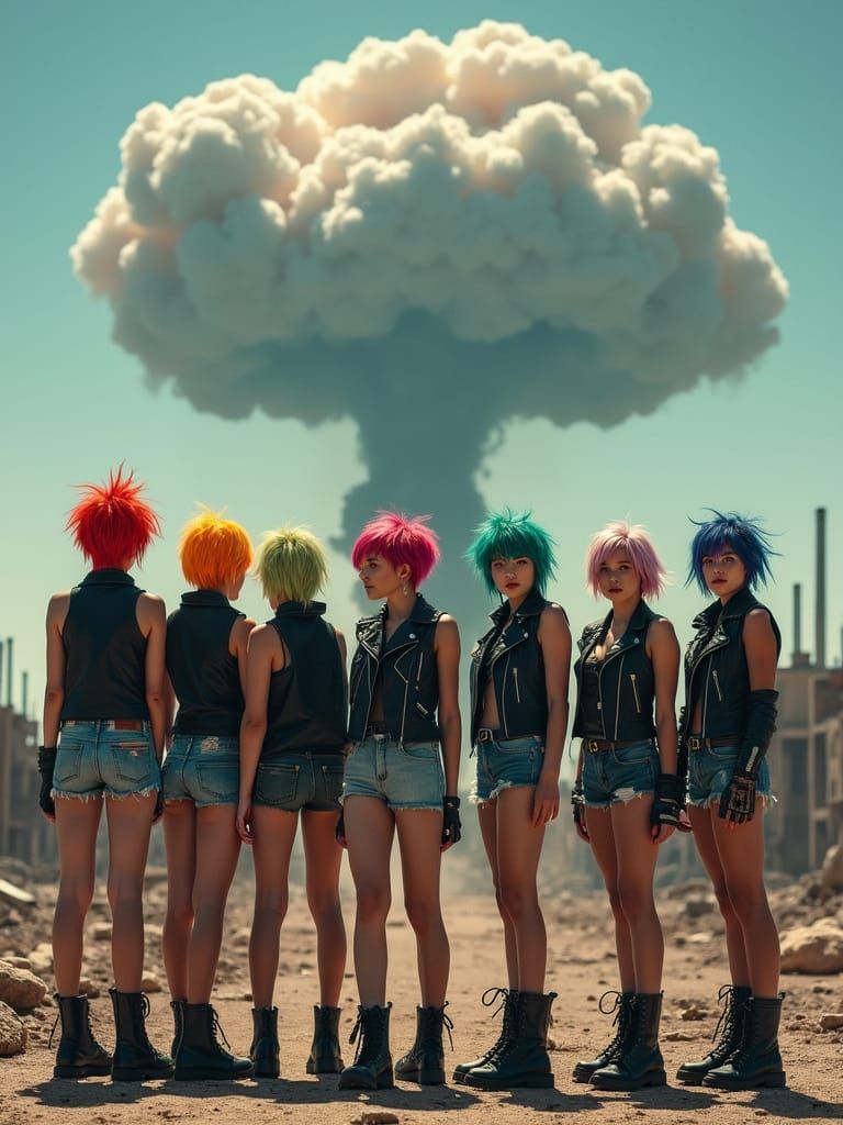 A group of young women in vibrant, rainbow-colored hair stand strong against a desolate, post-apocalyptic backdrop, surrounded by ruin and a massive mushroom cloud.