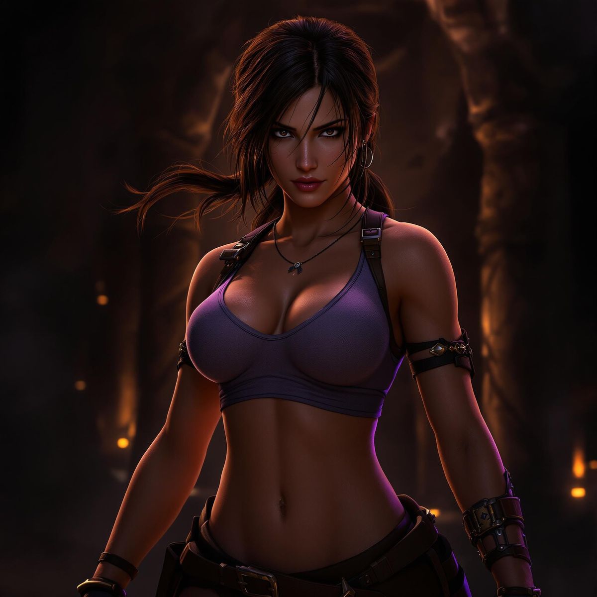 A striking picture of a muscular Lara Croft posing heroically in a dark fantasy setting. The image features intricate textures, dynamic lighting, and complementary purple and yellow colours, as trending concept art.