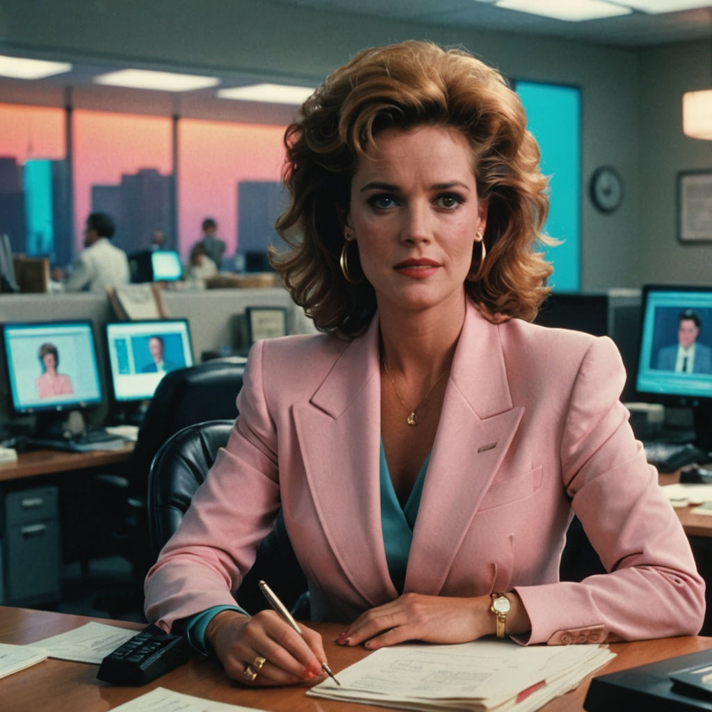This image captures the essence of 1980s office decor and fashion, inspired by the iconic film 'Working Girl'.