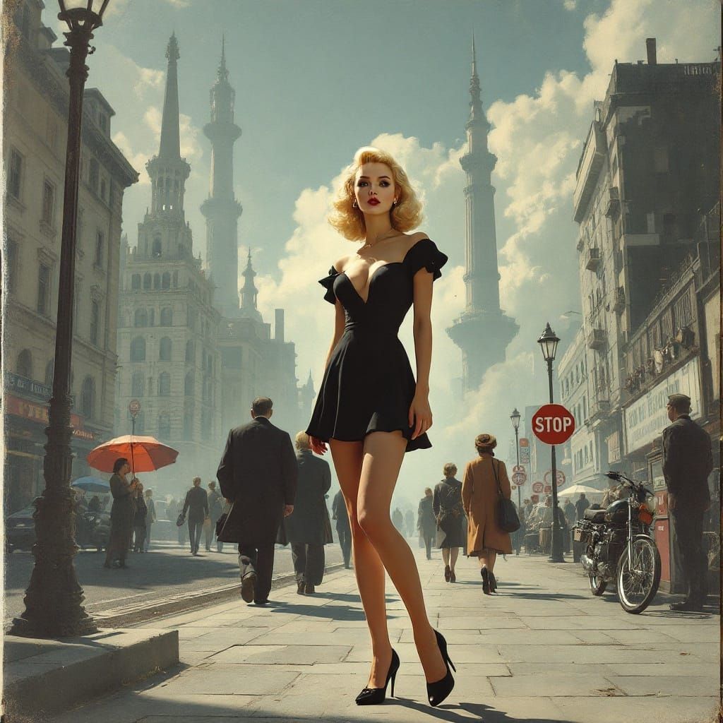 A striking picture of a confident blonde woman standing on a busy city sidewalk. The image is rendered in a metaphysical style, reminiscent of surrealist painting, and evokes a sense of contemplative beauty.