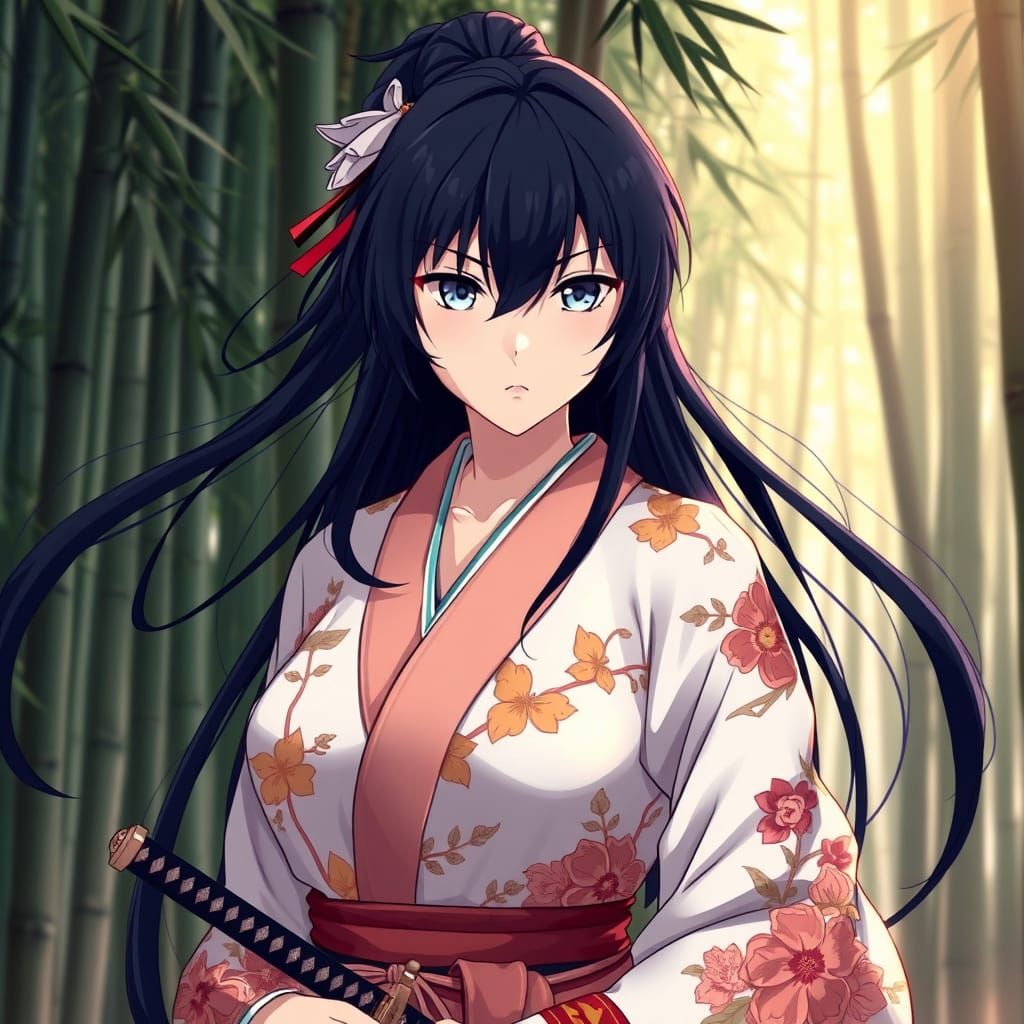 This image shows a striking anime samurai woman standing in a serene bamboo forest, clad in a beautifully detailed kimono with intricate floral patterns, her piercing eyes filled with determination