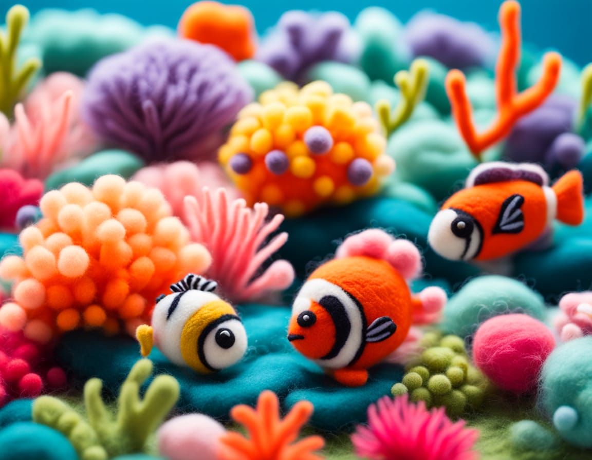 This image shows a vibrant underwater scene featuring felt art. Pom-pom coral and fish create a colorful, textile-rich environment with soft pastel lighting and fuzzy details. The artwork has a playful, whimsical style.