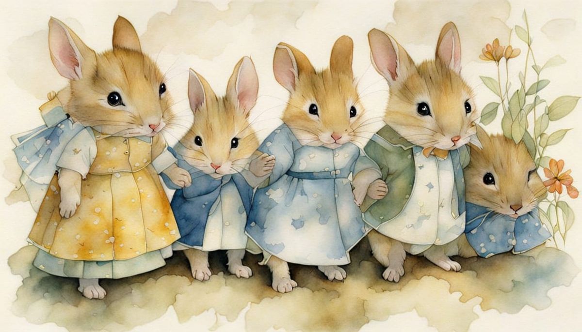 Easily generate your own cute bunny images in the style of Beatrix Potter for free. Unleash your creativity!