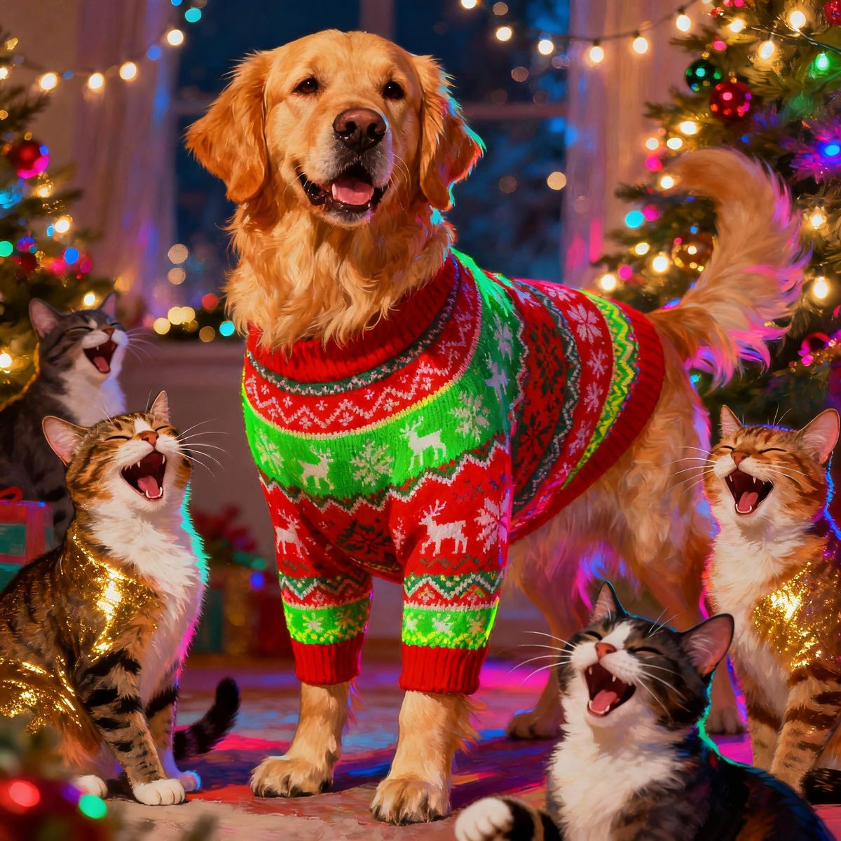 This image shows a happy golden retriever in a bright Christmas sweater, surrounded by laughing cats. Rendered as a detailed matte painting with warm, festive lighting and vibrant colors.