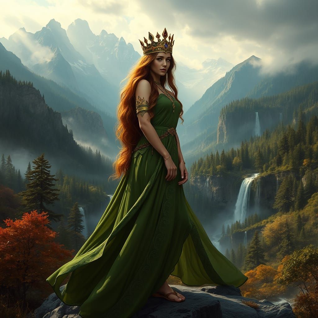 This image shows a powerful earth goddess with rich, chestnut-brown hair and a flowing emerald-green gown, set amidst a sweeping landscape of lush forests, mountains, and misty waterfalls, in a style reminiscent of epic fantasy worlds with intricate details and dramatic lighting.