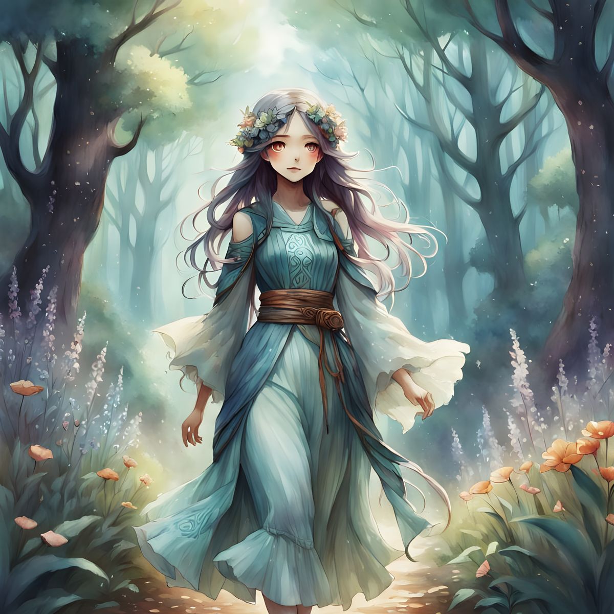 This image is a beautifully rendered anime-inspired illustration of a forest witch surrounded by vibrant flowers and herbs, set against a soft, ethereal backdrop of a fantasy forest, with delicate brushstrokes and intricate textures