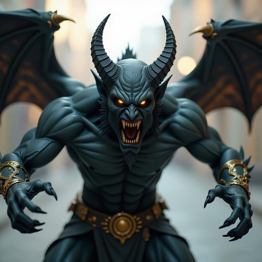 A striking picture of a snarling demon composed of dark alabaster. Gold accents highlight its monstrous form in a 35mm film style, with atmospheric lighting and hyperdetailed textures.