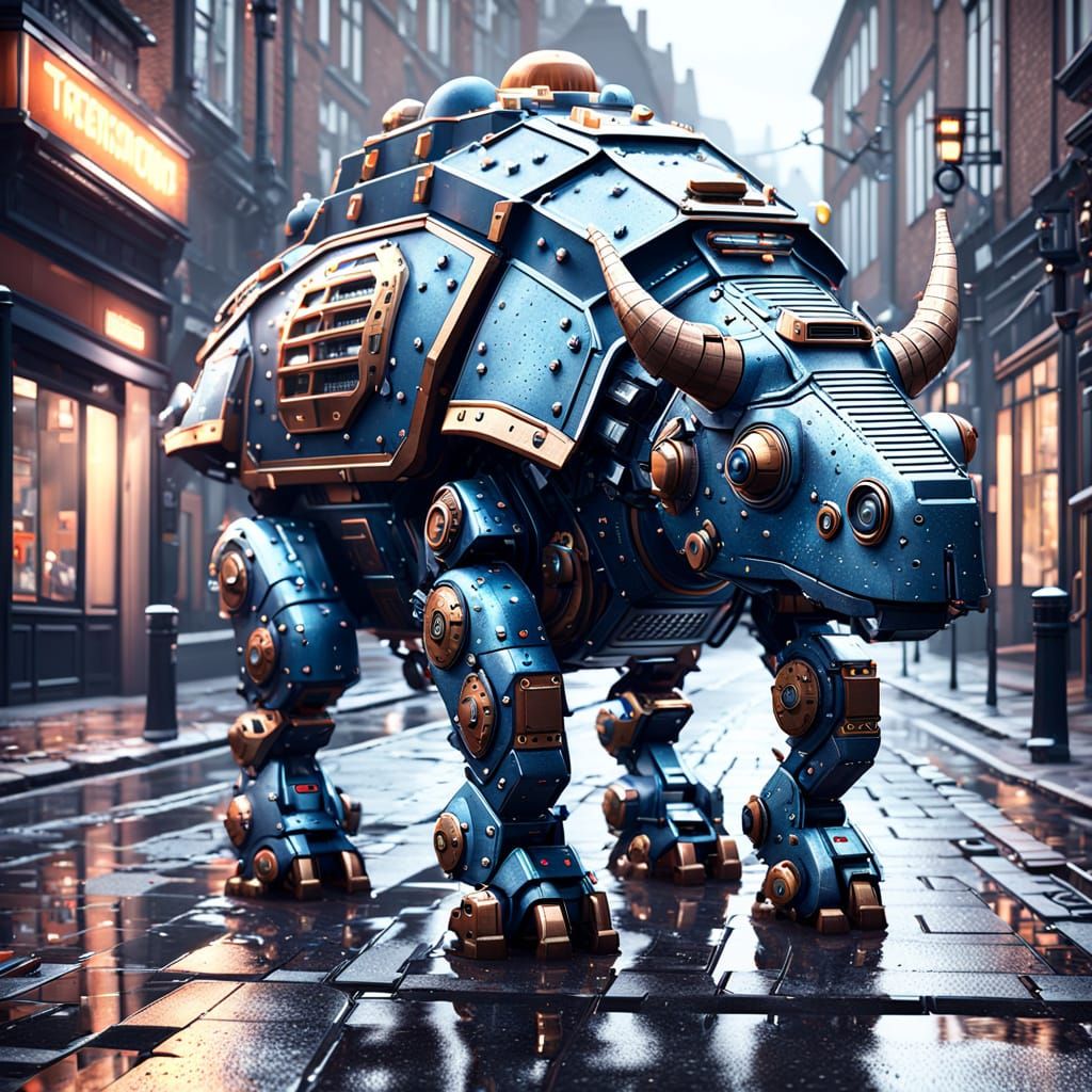 This image shows a triceratops dressed as an English police officer patrolling old, rainy cobblestone streets. The artwork is rendered as futuristic, sci-fi digital art with intricate mechanical details.