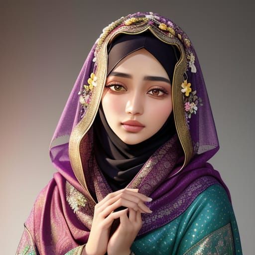 This image shows a young Muslim woman holding a vibrant floral arrangement. Her emerald green hijab is adorned with gold embroidery and jasmine flowers, set against a blurred Moroccan tile backdrop in a Renaissance portrait style.