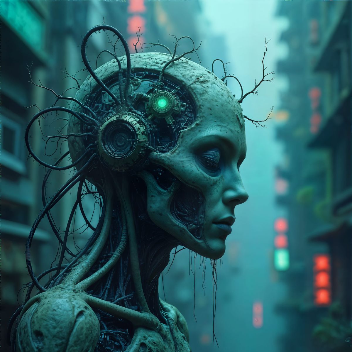 This image shows a fusion of biological and technological elements in a futuristic world, where organic forms meet synthetic innovation.