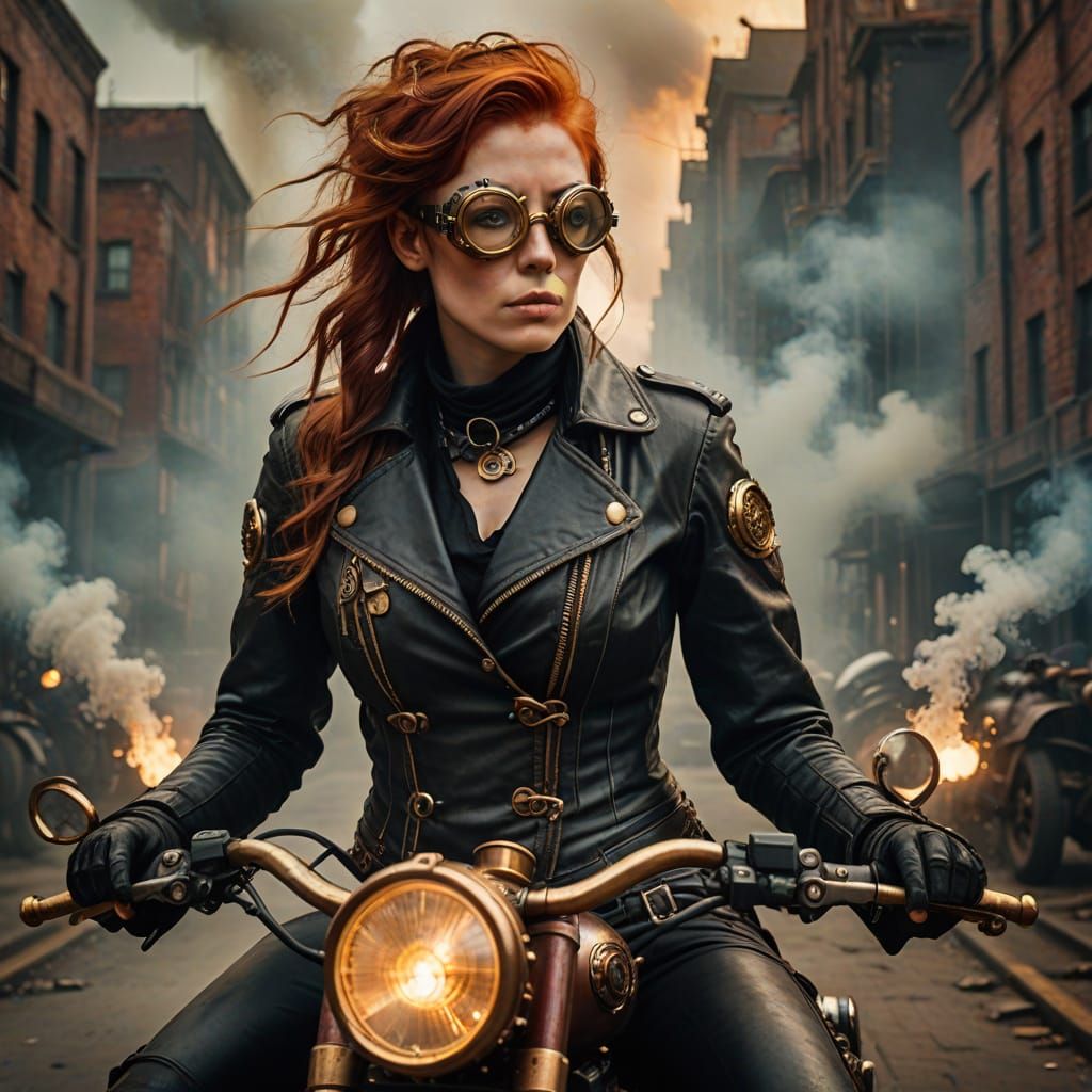 This image shows a red-haired woman riding a steampunk motorcycle through a dystopian city. The scene features industrial decay, leather and brass accents, and a warm golden light in a steampunk aesthetic.