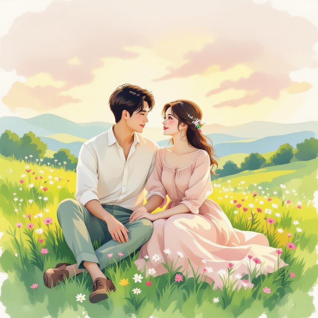 A young couple sits on a lush meadow at sunset, surrounded by wildflowers. Rendered in a soft, hand-painted watercolor style with dreamy romanticism.