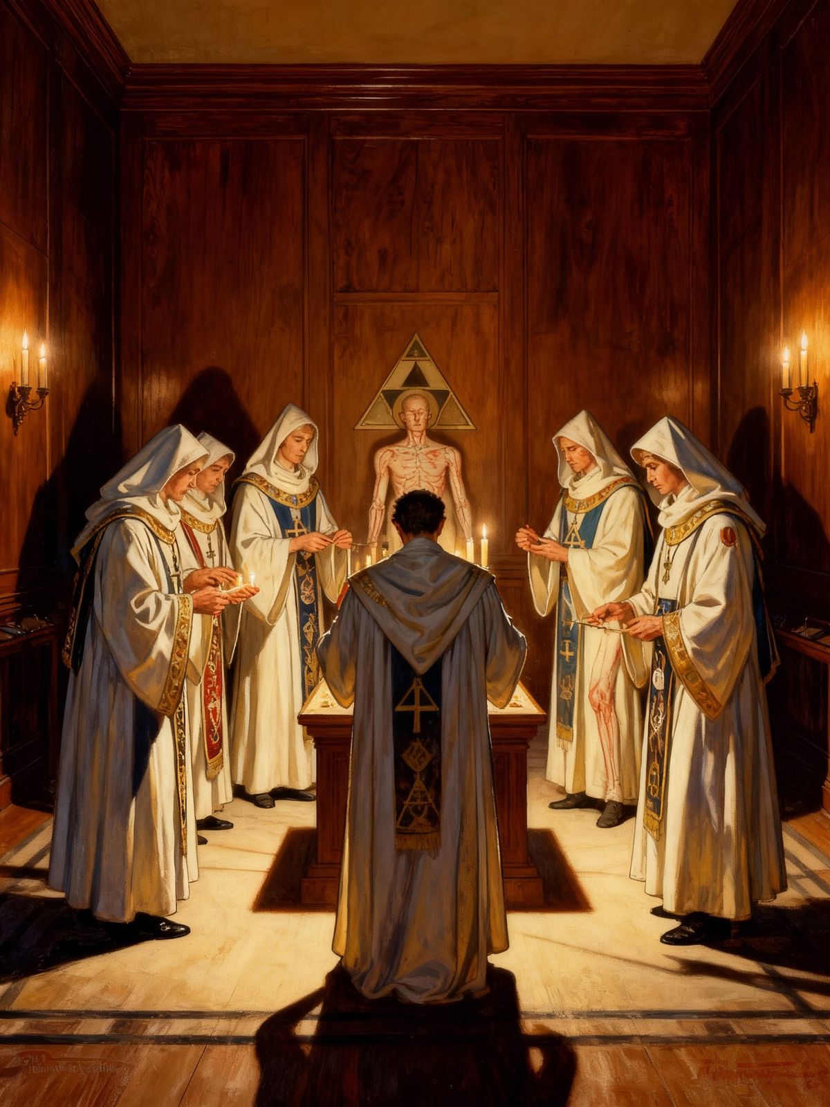 This illustration depicts robed figures in a candlelit chamber performing a mysterious ritual, rendered in the detailed, classic style of Norman Rockwell.