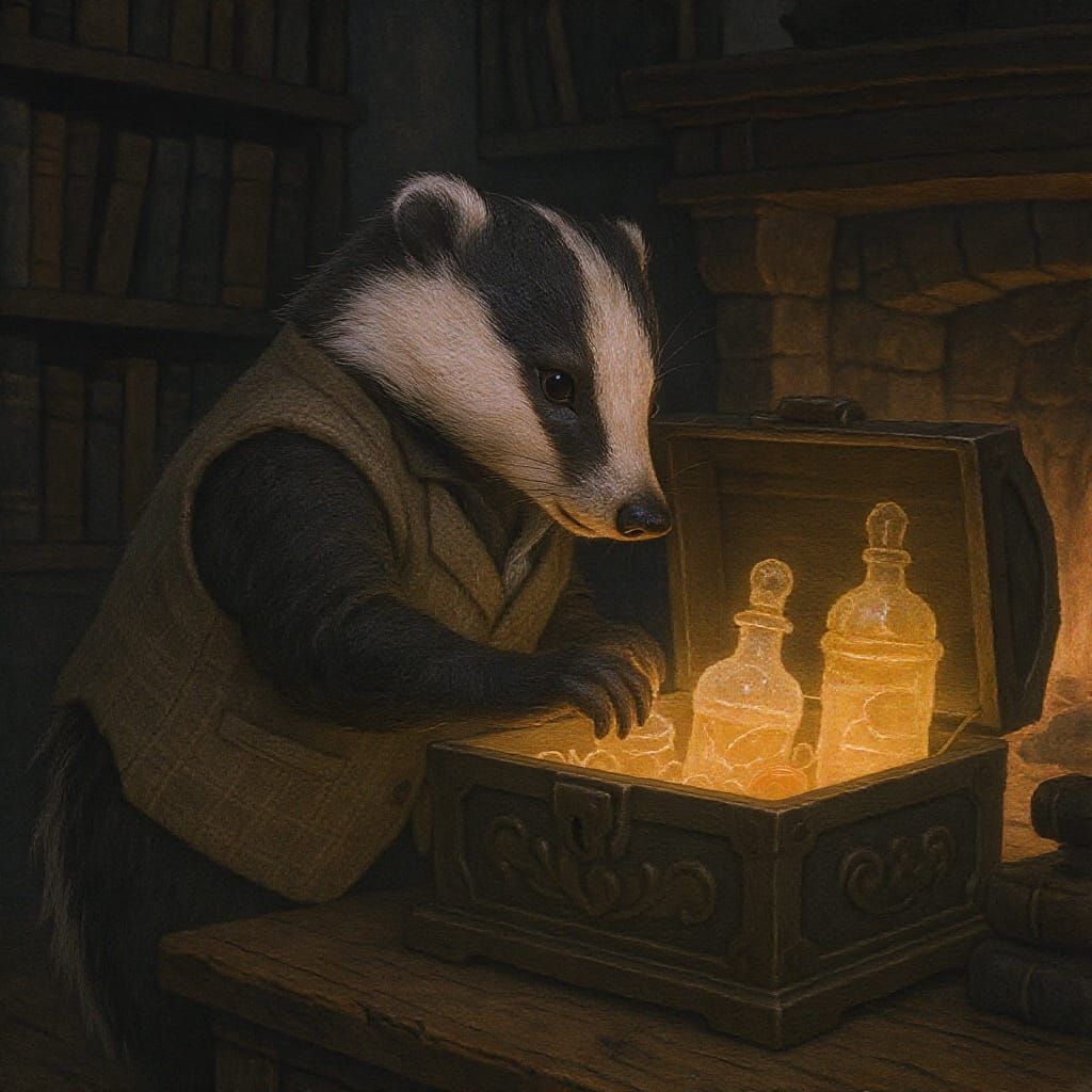 This image shows an elegant badger wearing a tweed waistcoat as it examines a treasure chest filled with glowing artifacts. The scene evokes classic storybook illustrations.