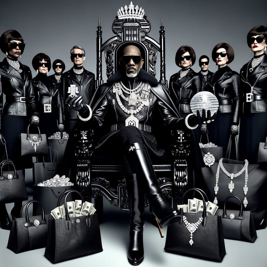 This image shows a stern woman in black leather attire seated on a throne, surrounded by female subjects in matching outfits. They offer her designer handbags filled with jewels and money, spoils from their heists.