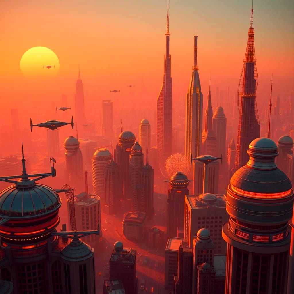This image showcases a utopian cityscape dominated by orange light, featuring retro-futuristic architecture and vintage flying vehicles. The scene has an optimistic feel, rendered in a smooth digital painting style with cinematic lighting.