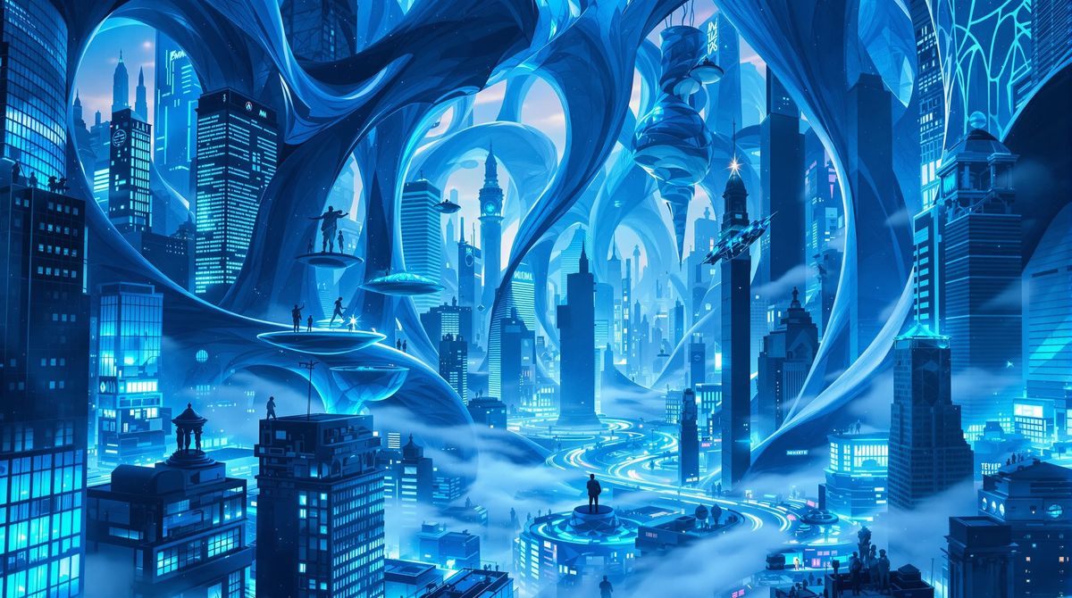 This image depicts a surreal cityscape dominated by deep blue hues. Skyscrapers twist and melt into the sky, with streets curving upward and floating structures drifting between buildings in a dreamlike, otherworldly atmosphere.