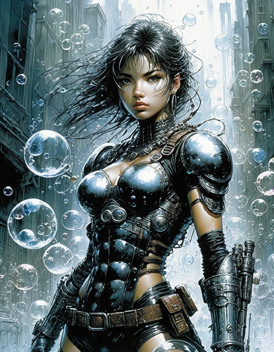 This image shows a collection of bubbles in an illustrative style. The artwork blends elements of fantasy illustration and impressionistic painting with comic art and anime aesthetics.