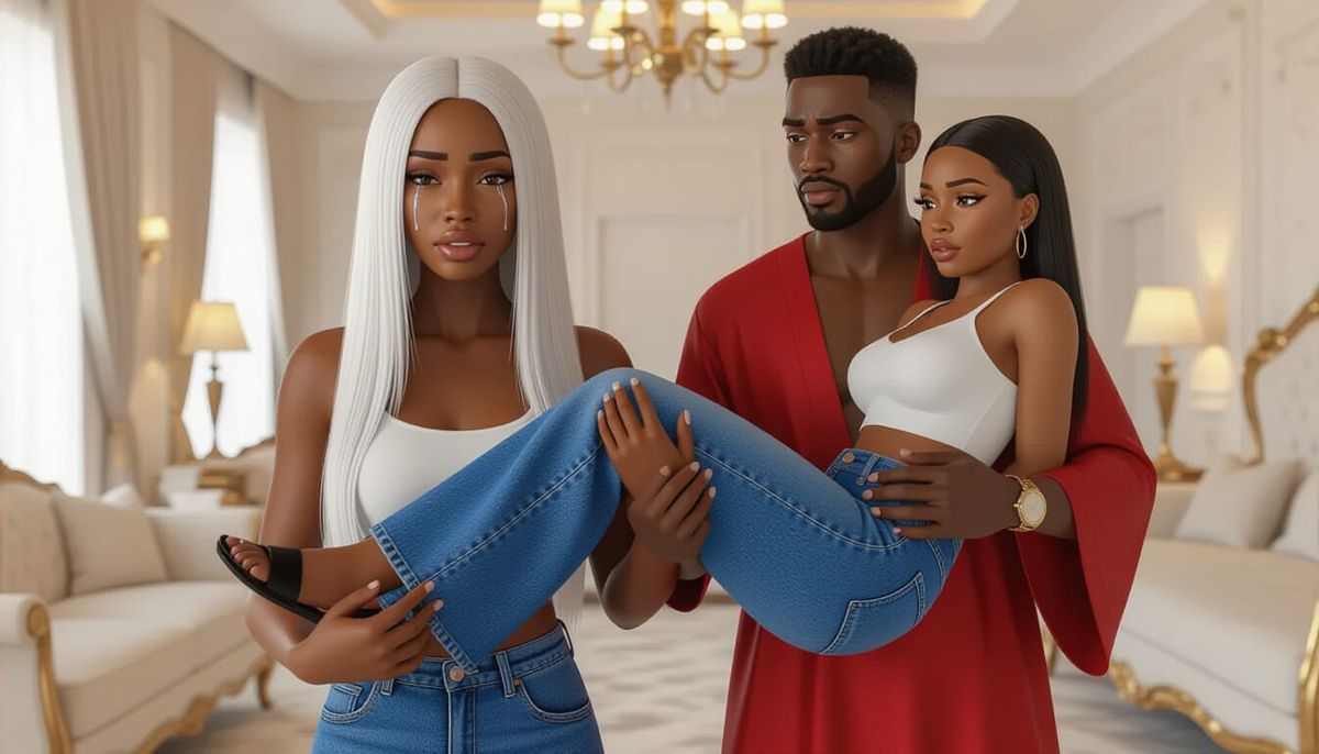This image showcases a hyperrealistic animated style portrait of a young African woman with white hair, wearing jeans and a crop top. It features dramatic lighting and deep shadows.