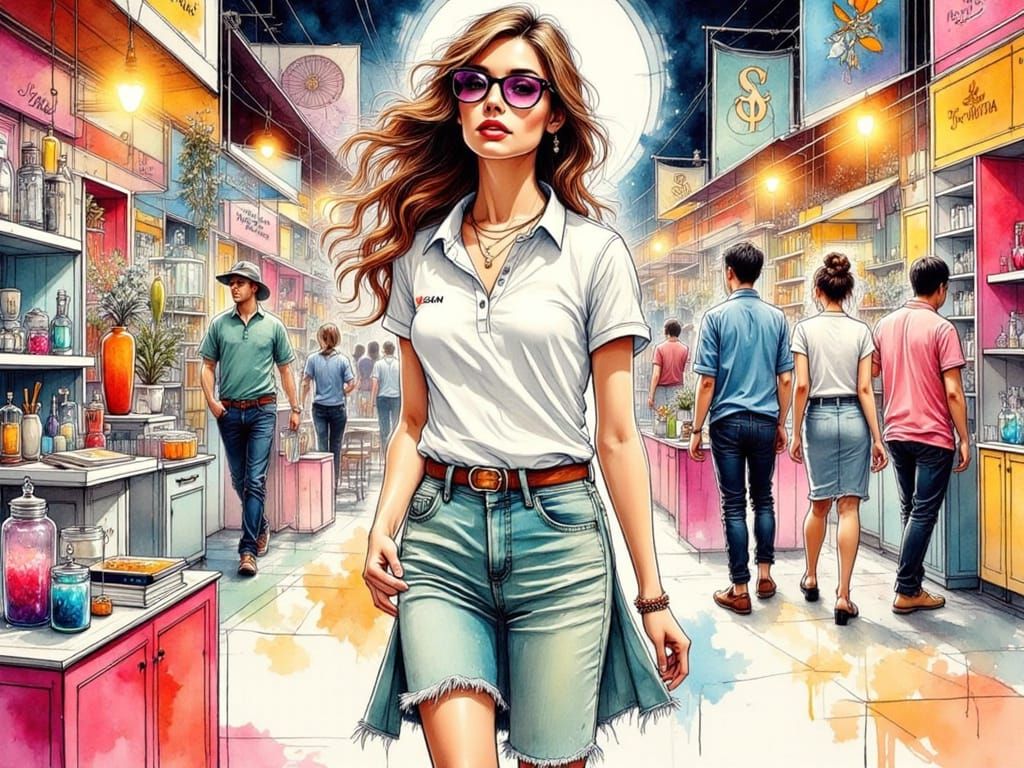 This image depicts a young woman in a colorful, dreamlike scene, walking among trade show booths in a style reminiscent of Matisse's expressive works and Mucha's elegant lines, with delicate textures and bold brushstrokes.
