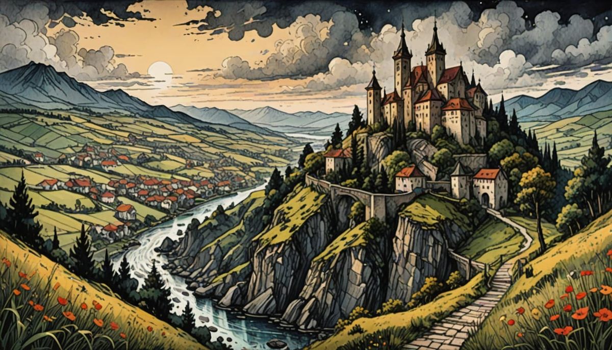 This image showcases a detailed landscape with muted organic colors, created using thick pen strokes and ink drawing techniques.