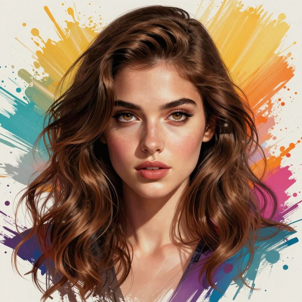 This image shows a hyperdetailed portrait of a woman with long, wavy brown hair and striking brown eyes. Dynamic lighting and vibrant colors create an artistic, volumetric effect.