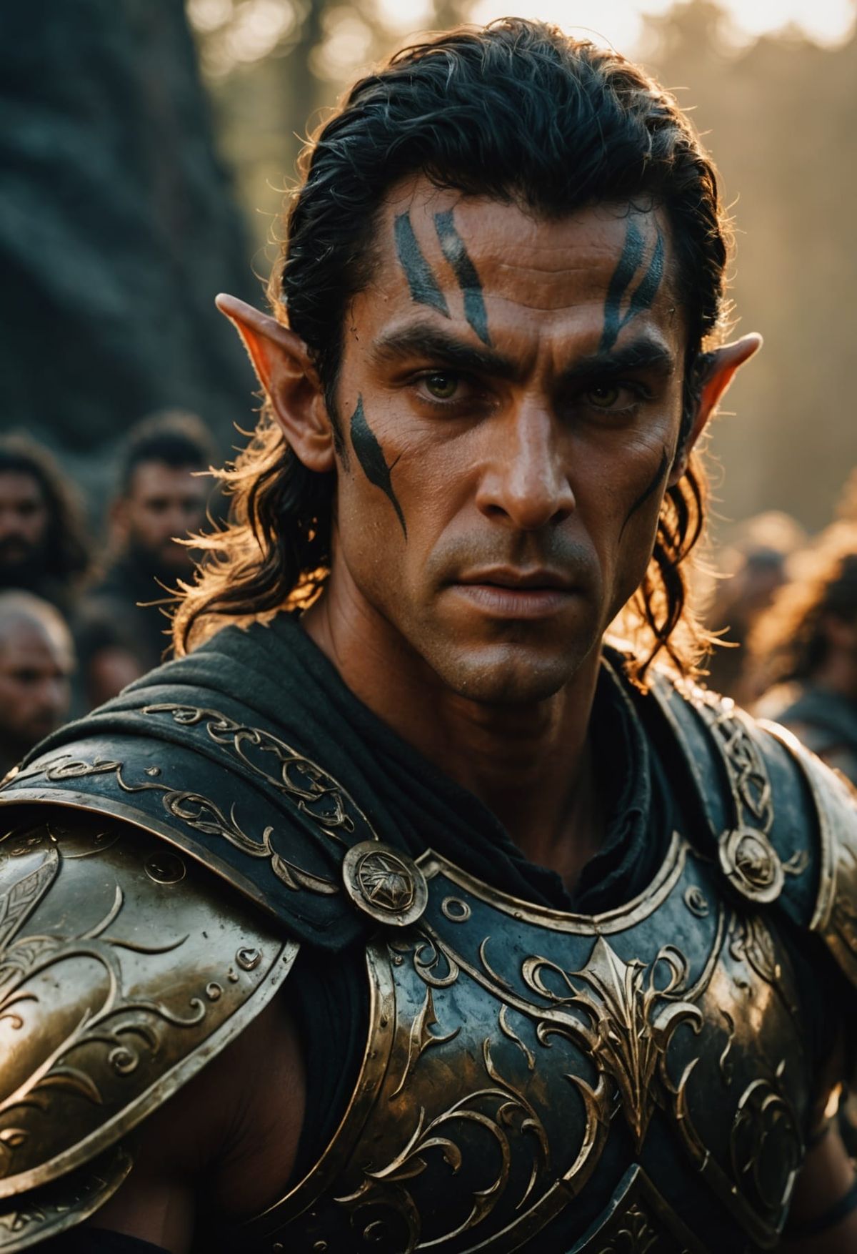 Cinematic film still. Medium shot. A male Elf warrior with battle paint fights. Close up. Dark fantasy art style. Intense eyes sparkle. Dra...