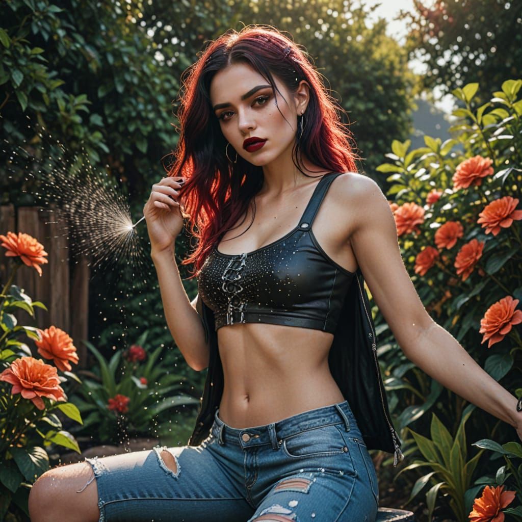 This image shows a young woman with dark makeup and a midriff-baring outfit sitting in a backyard. The neo-impressionist photo features warm golden tones, soft lens flare, and dynamic shadows.