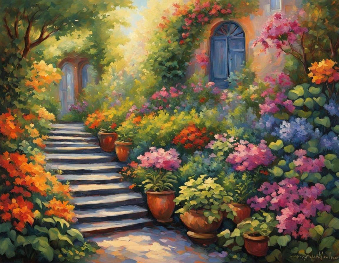This oil painting features a winding stone staircase leading to a bright sky, adorned with lush plants and vibrant blossoms in a serene garden setting. Rendered with thick, impasto strokes, it captures the warm glow of golden hour.