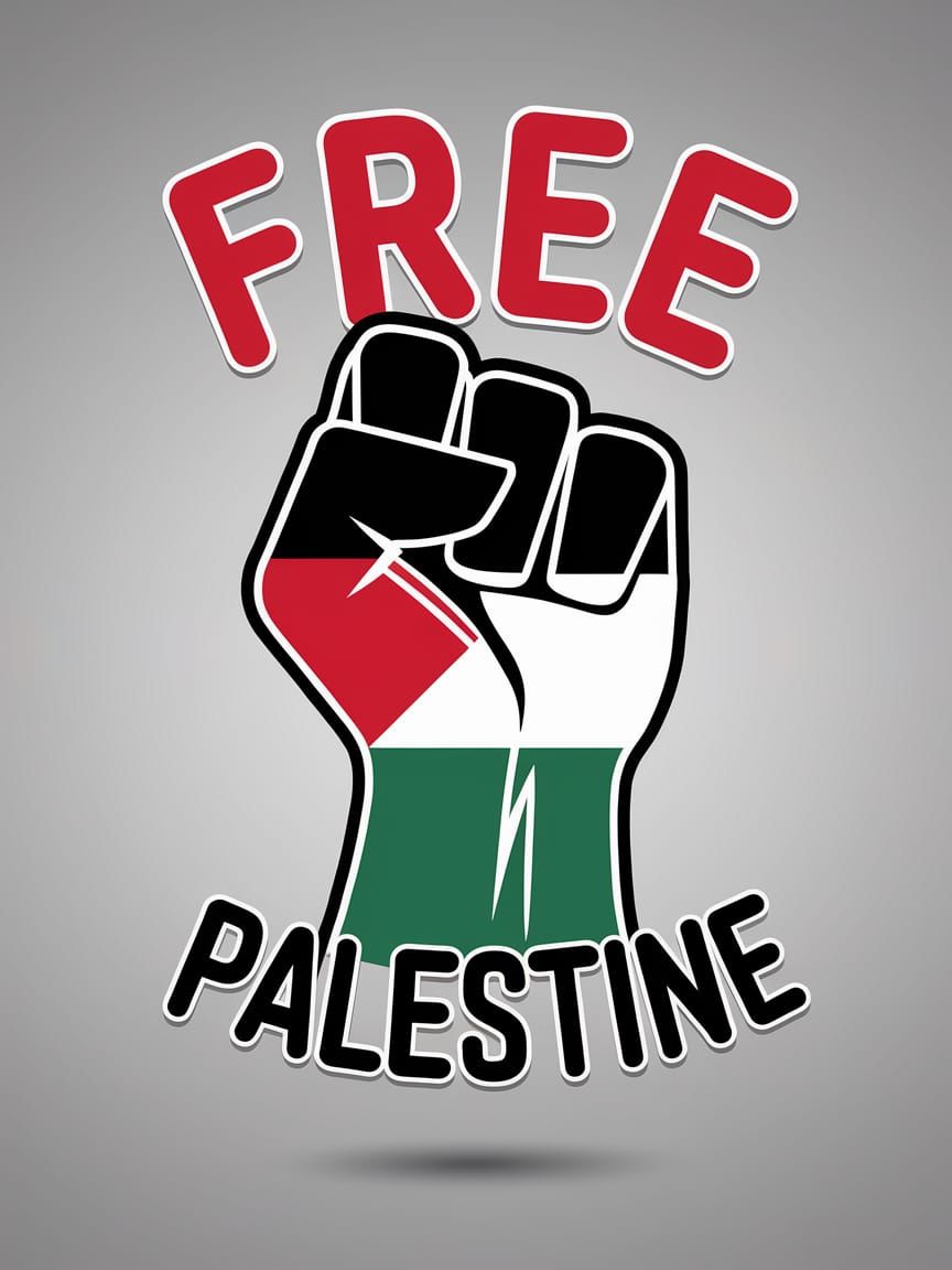 This image features a solidarity fist in Palestinian flag colors, set against a backdrop of the Palestinian flag. Red text reads 'FREE' at the top with 'PALESTINE' at the bottom.