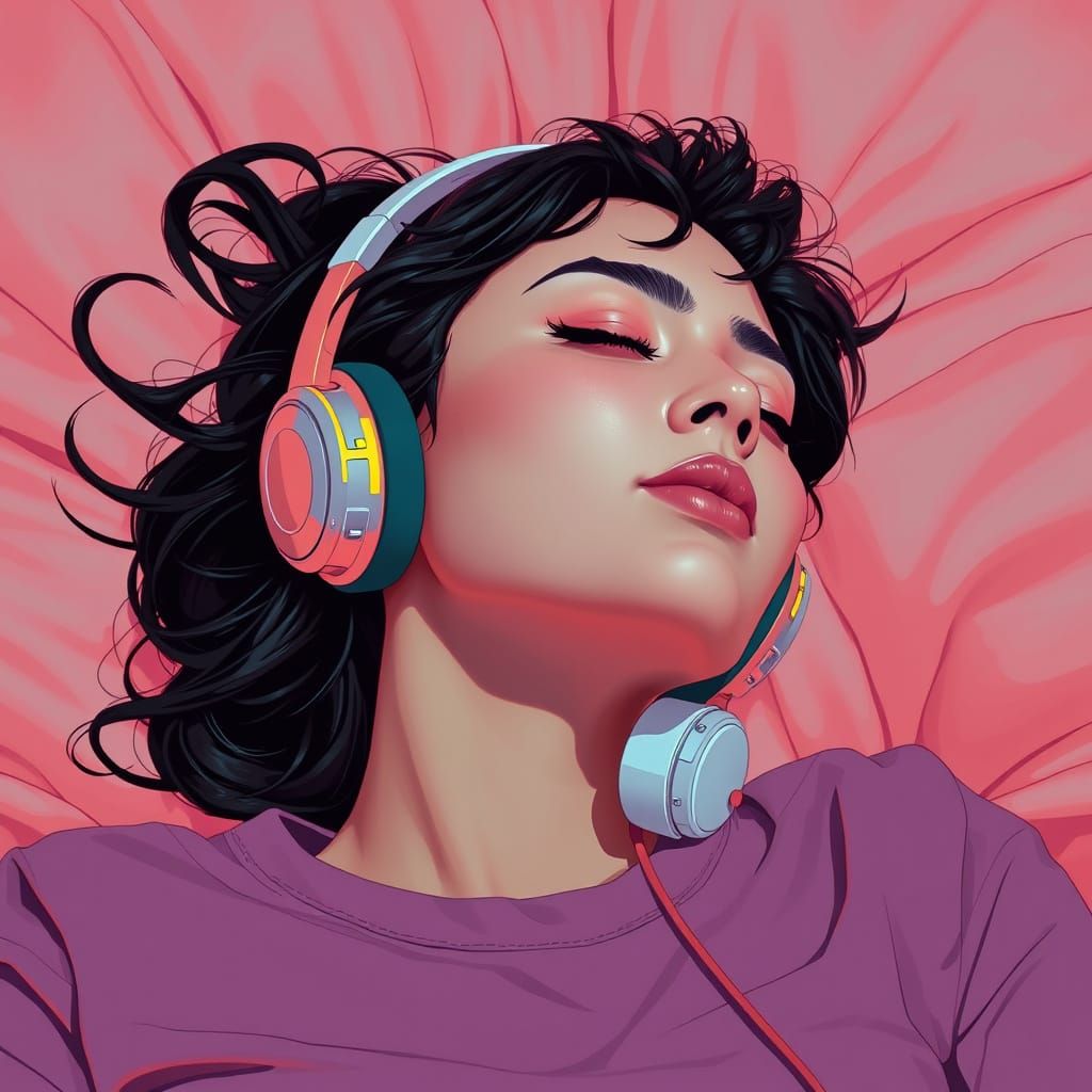 This image shows a woman with headphones, eyes closed, and a peaceful expression. The artwork features soft pastel colors, flowing lines, and an overall art nouveau and futuristic aesthetic.